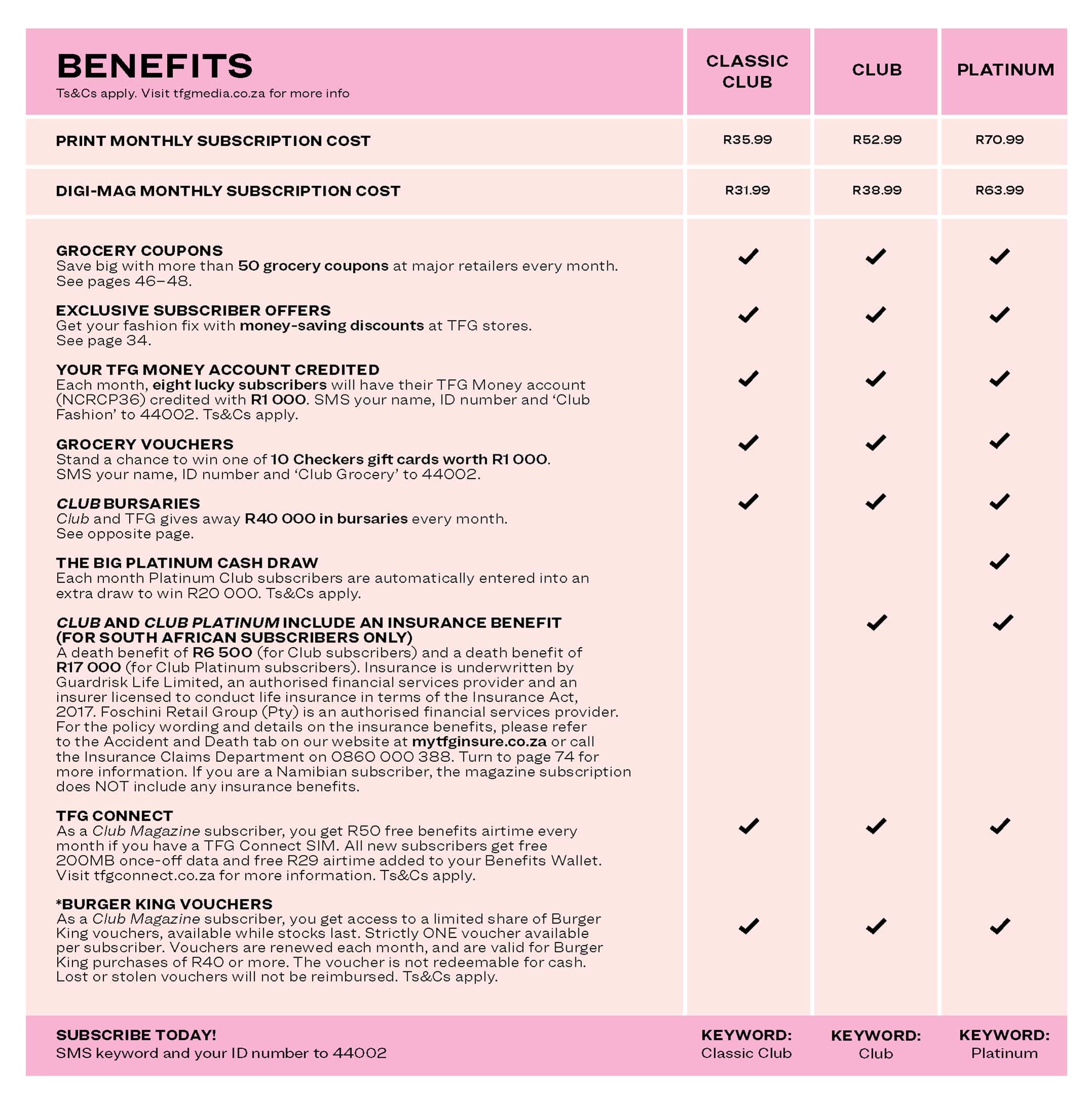 Club magazine is a monthly The Foschini Group (TFG) magazine that offers readers great lifestyle, fashion and beauty tips, as well as incredible benefits.
