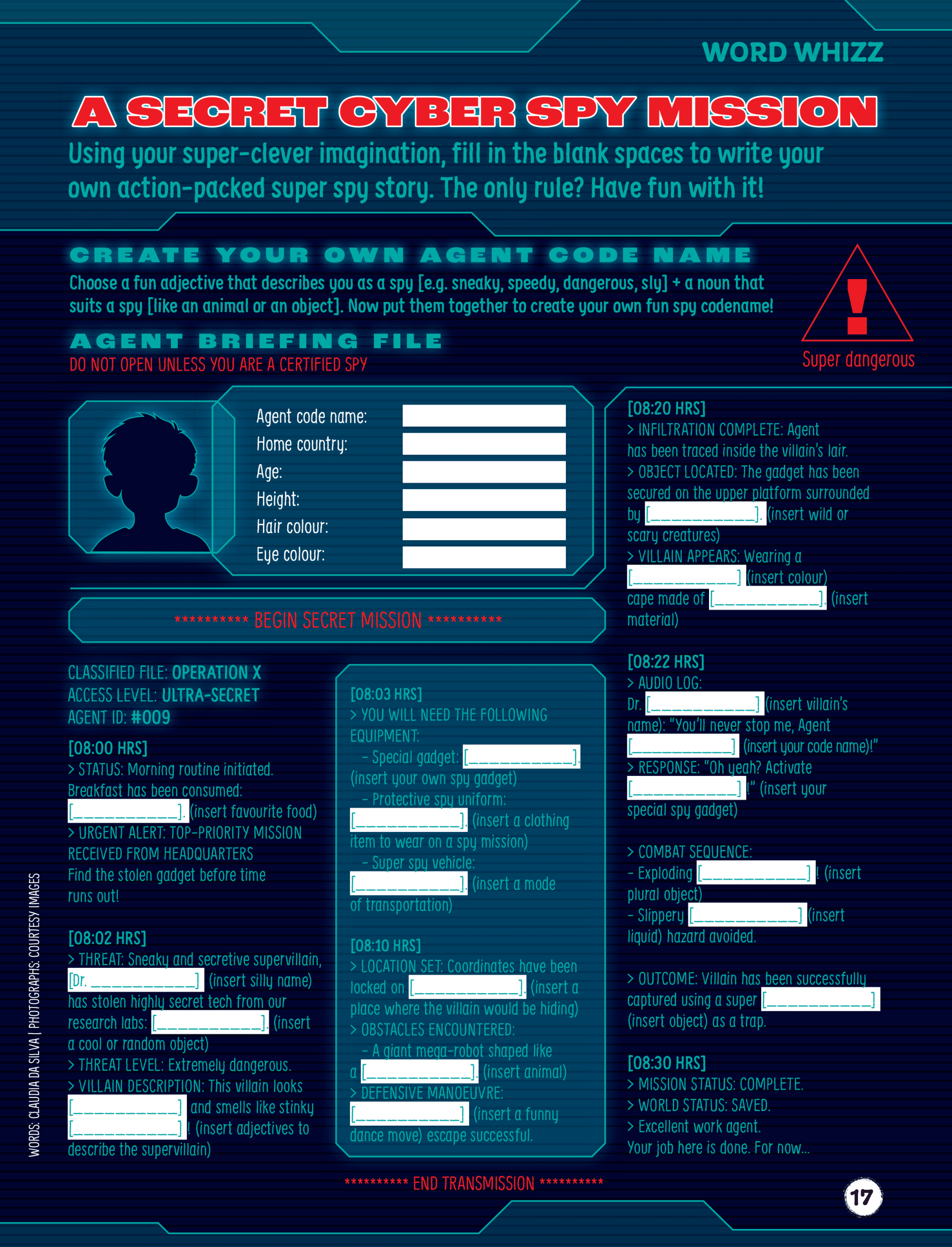 Using your super-clever imagination, fill in the blank spaces to write your own action-packed super spy story. The only rule? Have fun with it!