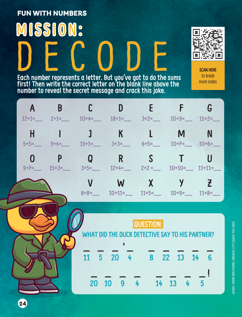 Each number represents a letter. But you’ve got to do the sums first! Then write the correct letter on the blank line above the number to reveal the secret message and crack this joke.