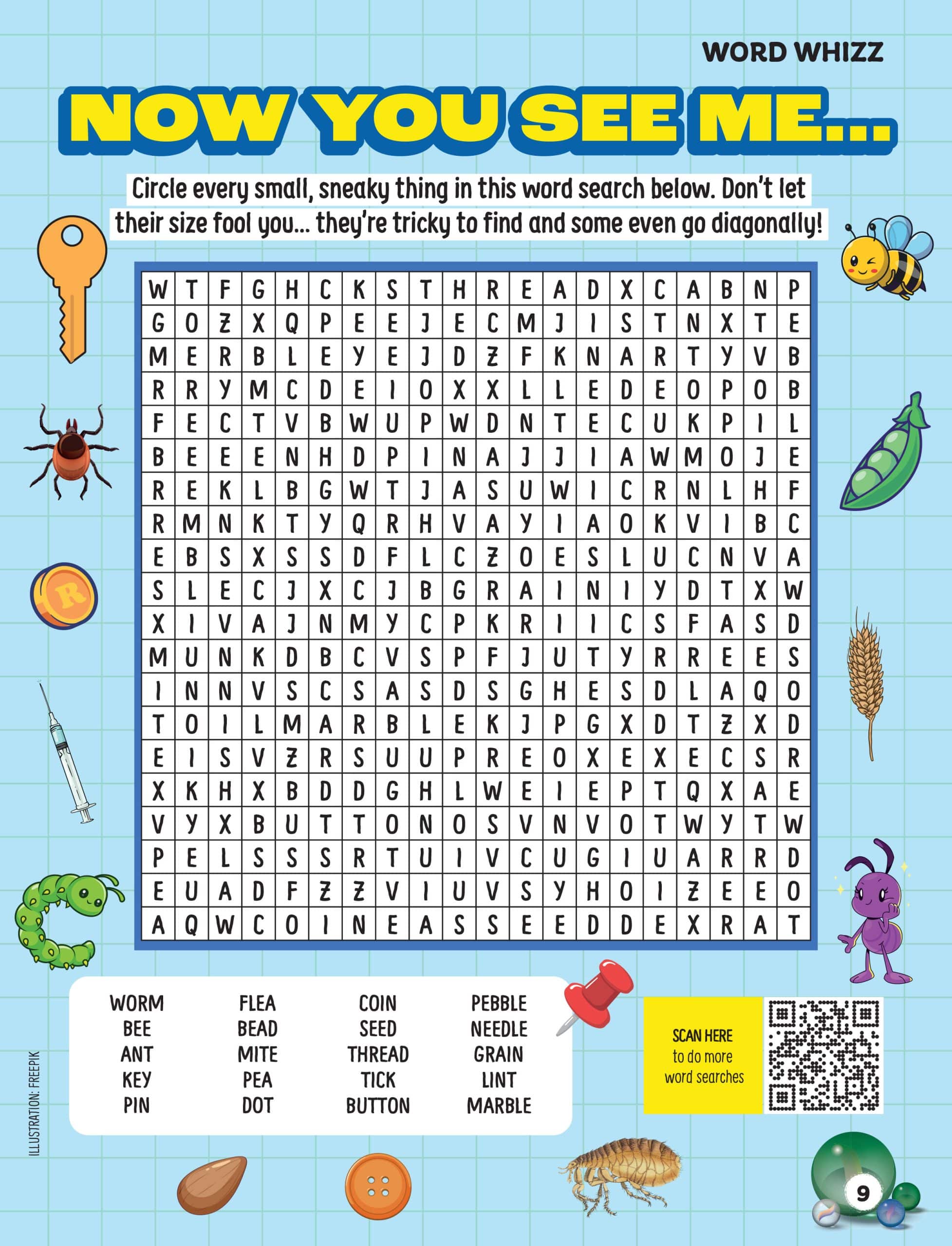Circle every small, sneaky thing in this word search below. Don’t let their size fool you… They’re tricky to find and some even go diagonally!