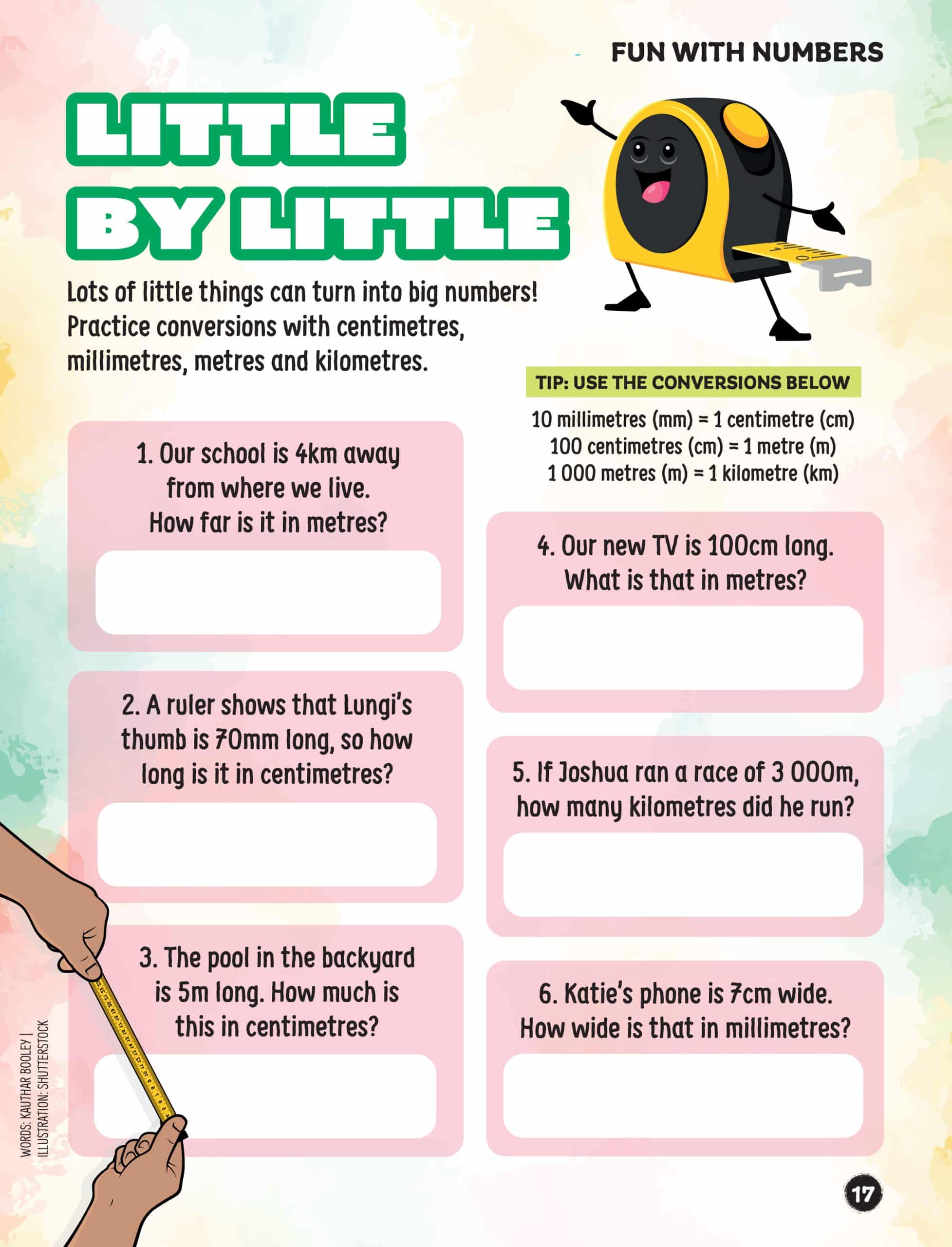 Lots of little things can turn into big numbers! Practice conversations with millimetres, centimetres, metres and kilometres.