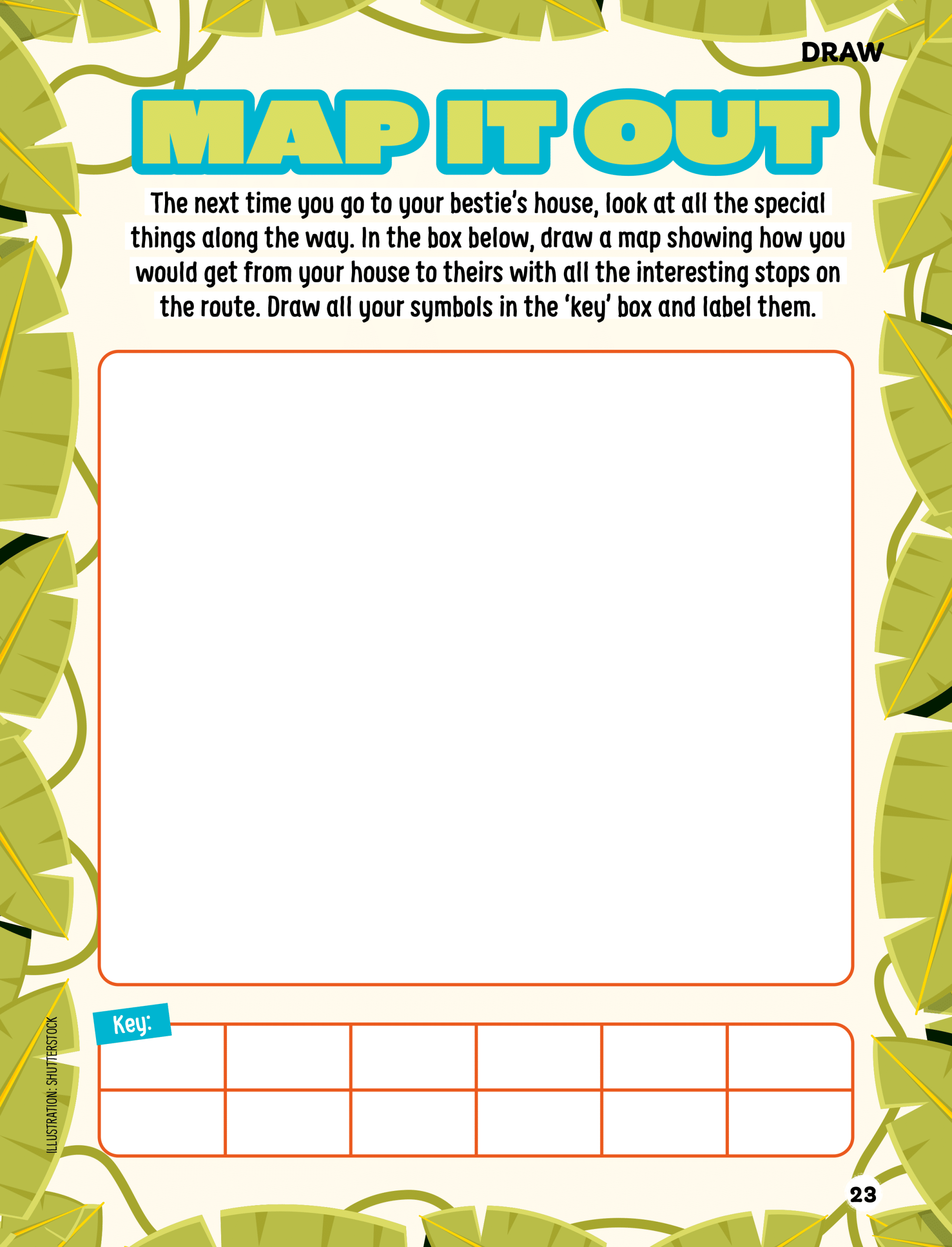 The next time you go to your bestie’s house, look at all the special things along the way. In the box below, draw a map showing how you would get from your house to theirs with all the interesting stops along the route. Draw all your symbols in the ‘key’ box and label them.