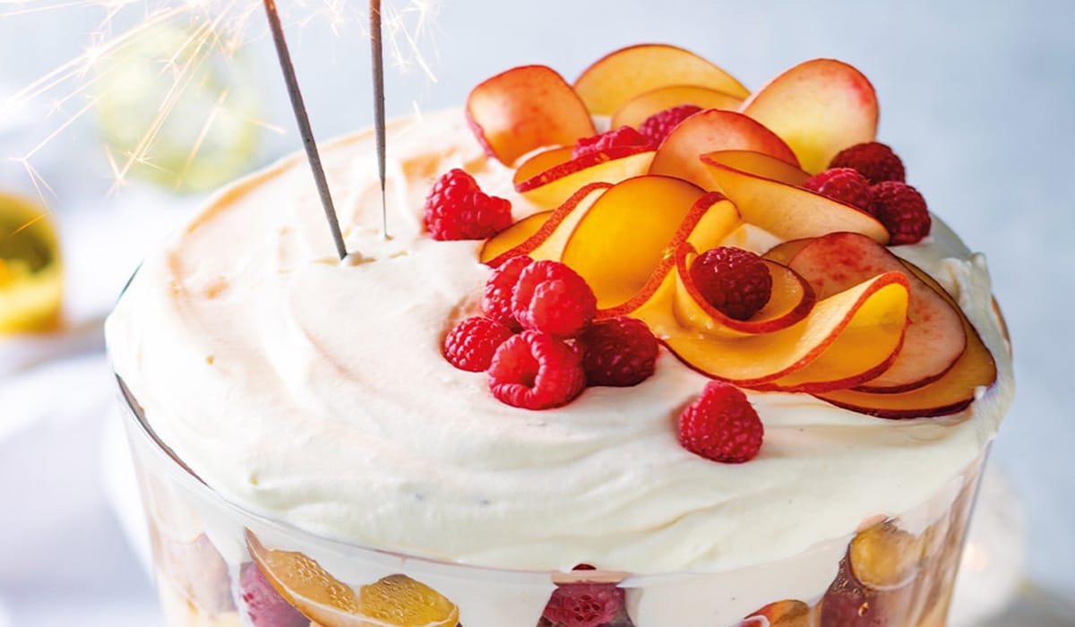 - Pour custard over cake and layer with remaining cake and raspberries, then nectarines.