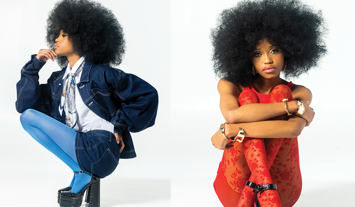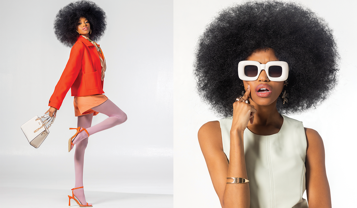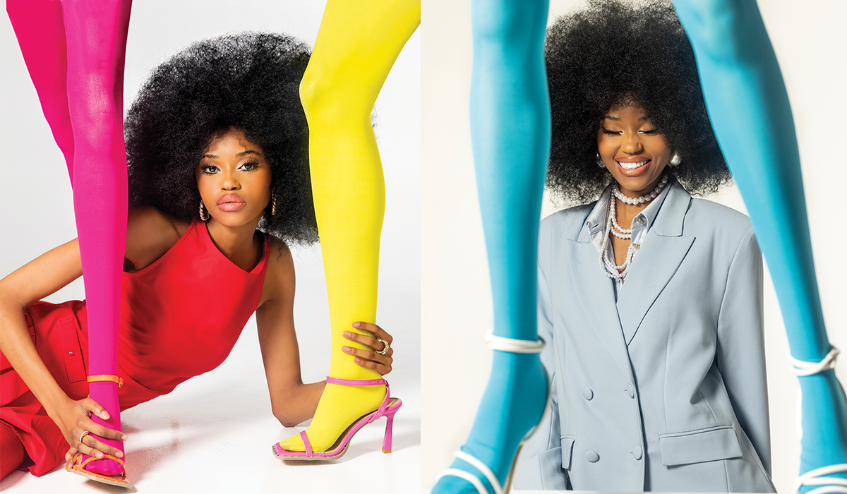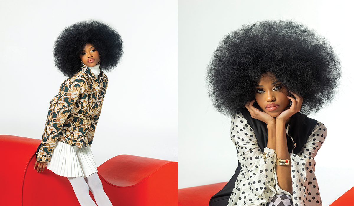 Left: Harrington tapestry men’s bomber jacket R799.99, Foldover funnel-neck knit top R129.99, Pleated mini skirt R249.99, all The FIX Luella jacquard-print bow-detail pumps R699, Foschini (belt, earrings and tights stylist’s own)