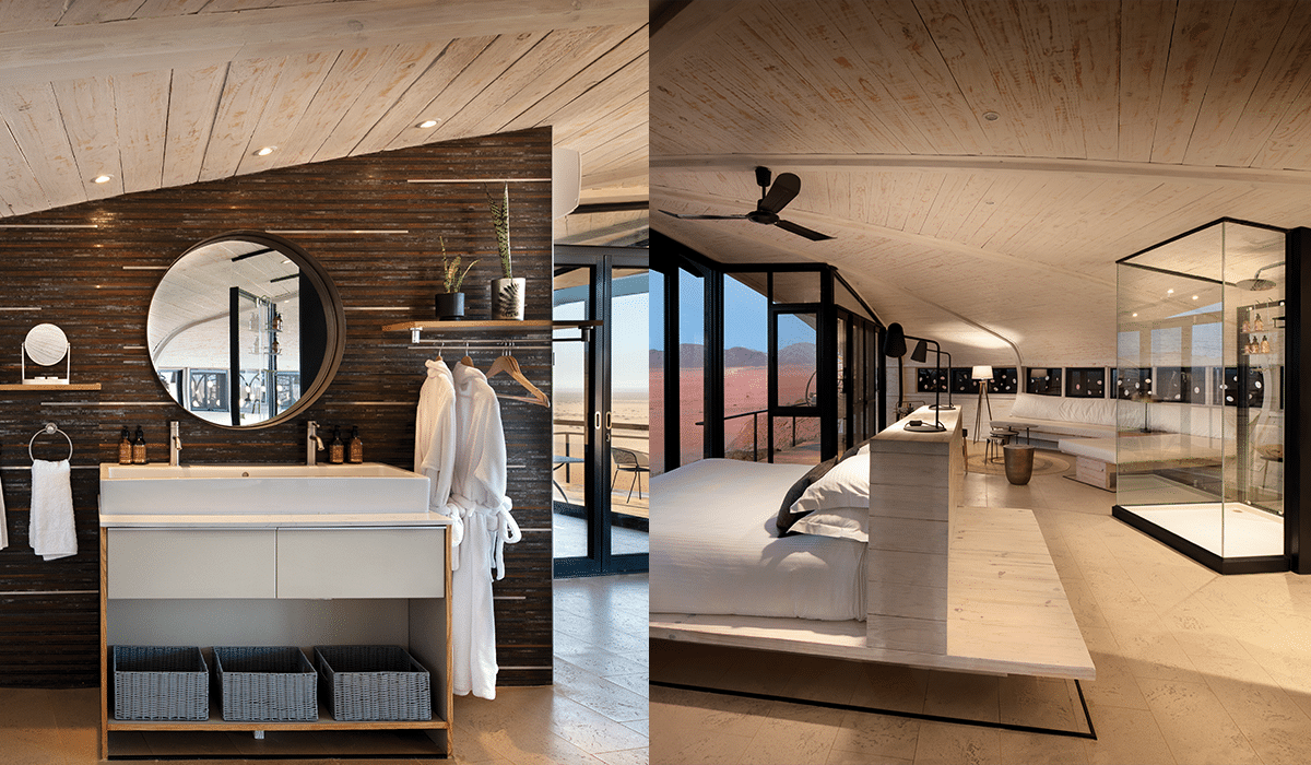 The contemporary design in the most natural of surroundings allows for guests to have a luxurious experience without compromising on comfort. This stark contrast between the two also allows for the desert to shine all on its own. The arid landscape, endless views as far as the eye can see as well as the feeling of being immersed in these surroundings is unmatched. The design itself, with its curved lines, earthy colours and stone textures, harmonise effortlessly with the desert around it. Giant windows frame the Namib like an ever-changing artwork, turning dunes, cliffs and sky into living murals.