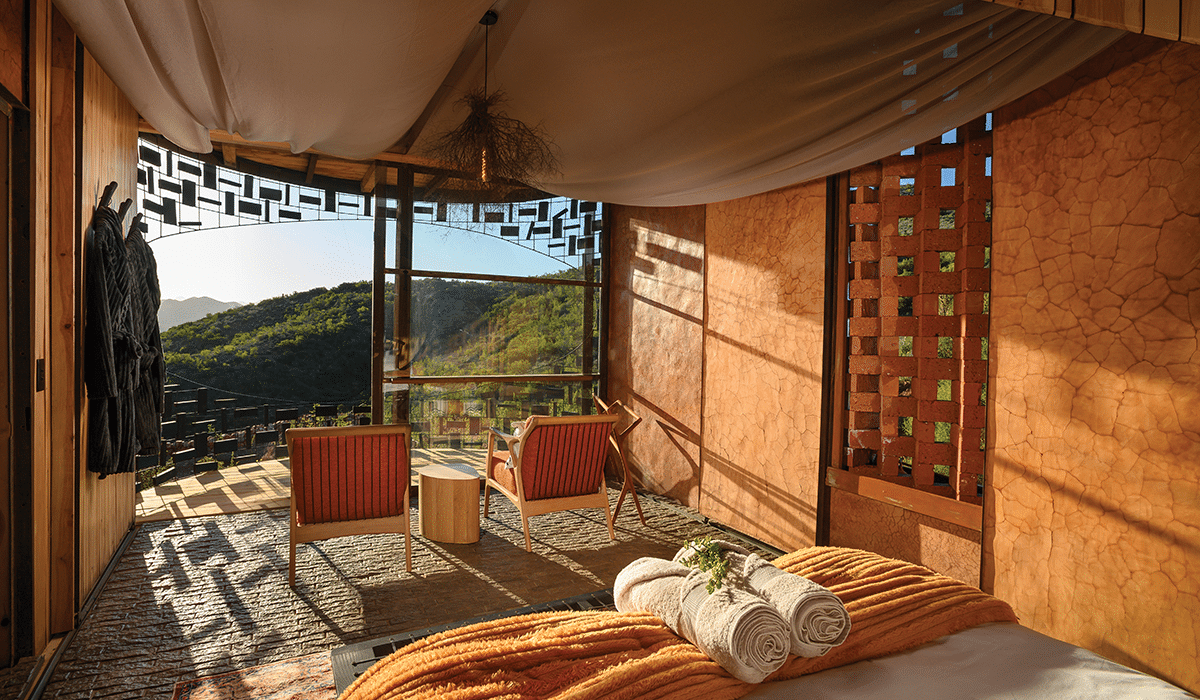 Cradled beneath a rugged koppie in the vast expanse of the Klein Karoo, the Starlit Cabin is a masterclass in architecture that harmonises with raw nature. Starlit Cabin is a collaborative vision of Joram Design, the interior sister-company of internationally recognised furniture studio Meyer von Wielligh and designers, Abrie and Jorika von Wielligh. Designed with a deep reverence for the land, the structure is engineered from sustainable materials such as stone, clay, wood and mud that were thoughtfully chosen to tread lightly on the earth. The discarded metal grain silo, salvaged from a local farmer, has been repurposed into a sculptural front door, a wood-fired outdoor hot tub, and an expansive skylight above the bed which teleports guests to the mystic cosmos of the Klein Karoo. Three-quarters of the structure sits below ground, echoing the desert burrows of the Karoo and providing a sheltered retreat. Organic curves flow through the interior in custom furnishings, as every room pays tribute to the owners’ abiding love for nature’s artistry. Outside, the landscape is sculpted into a desert oasis as indigenous plants and cacti frame the view, while lounge chairs, a fire pit and hot tub invite long sun-soaked days and starlit evenings.