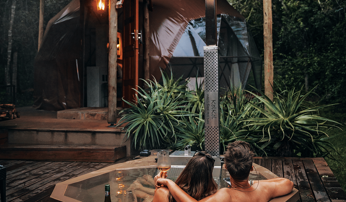 As far as couple getaways go, this property has been designed for lovers, by lovers. With help from family and farm crew, the host couple have poured their hearts into designing and building the Nightjar. An idyllic romantic hideaway, this place is embraced by nature, where uninterrupted romance feels woven into every detail. The earthy interior is foreshadowed by the cabin’s enchanting timber-clad exterior immersed within the bush. The interior is the host’s personal love-letter to functional beauty, blending unique accents and finishes with finely made furniture as well as elements crafted from oak, cypress and cedar harvested on the property. Even the bed, vanity, kitchen and breakfast nook have been lovingly shaped from a large oak slab sourced right from their farm. While the entire lodge is a moment in itself, a magical scene is set as the private deck and hot tub leads towards the Nightjar’s intimate dome bedroom, which acts as the most perfect cocoon to seek solace in as the outside world fades, and connection takes centre stage.