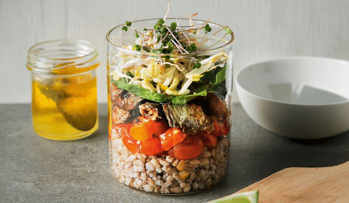 5. Place the barley at the bottom of a jar, followed by theroasted tomatoes, pilchards and baby spinach. Top with bean sprouts and drizzle with dressing.