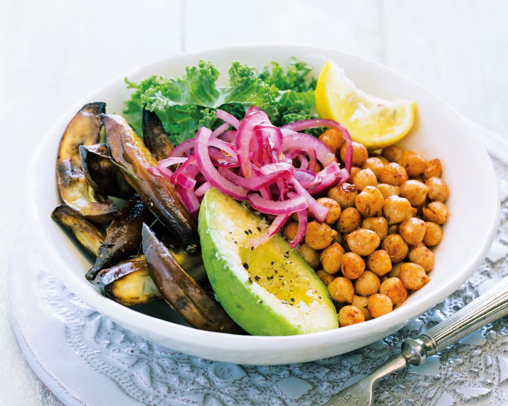 5. Arrange avocado halves in a bowl with the kale, sweet potato, red onion and chickpeas. Serve with parsley pesto and a lemon wedge.