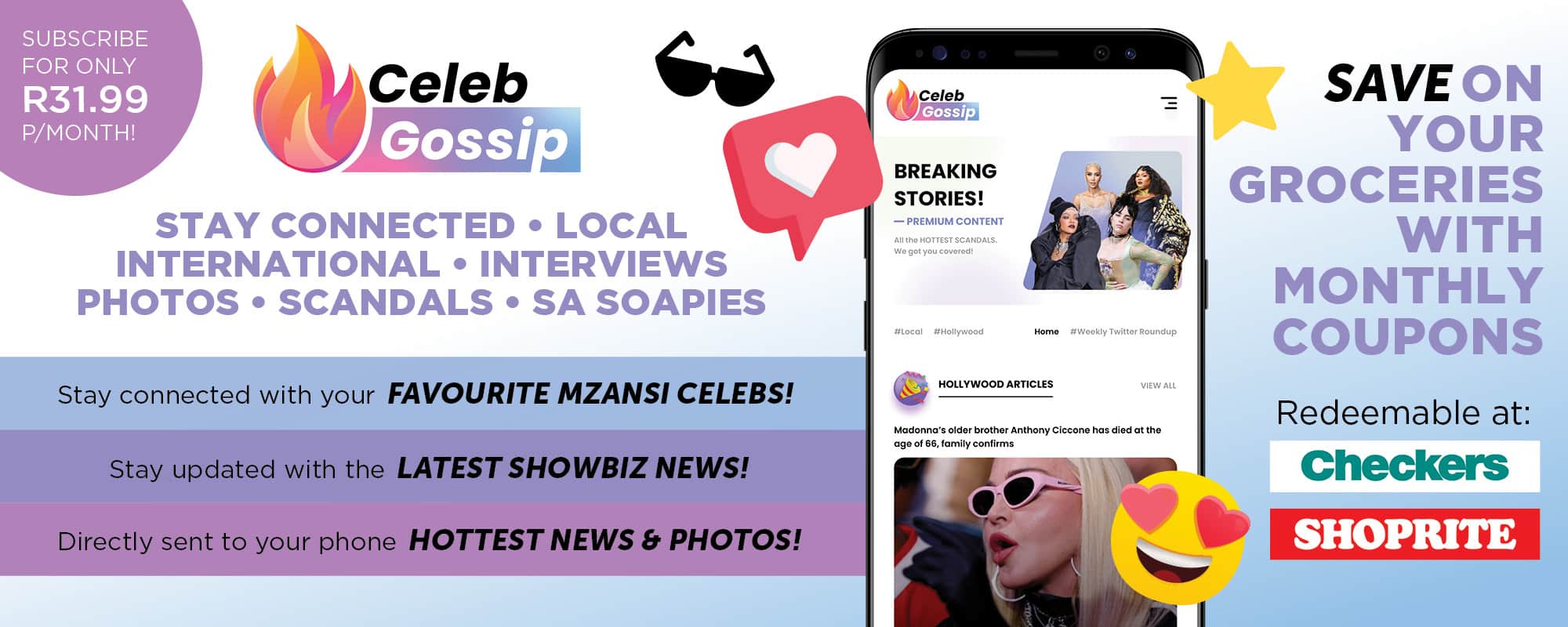 Stay up to date with the latest showbiz news! Get the latest inside scoop on all celebrity news as and when it is happening! Celeb Gossip offers two video categories which cover the most recent celeb gossip round-ups, movie premieres and news, red carpets moments, fashion events, and more! It also offers teasers for local South African soapies, as well as articles covering local celeb news and gossip.